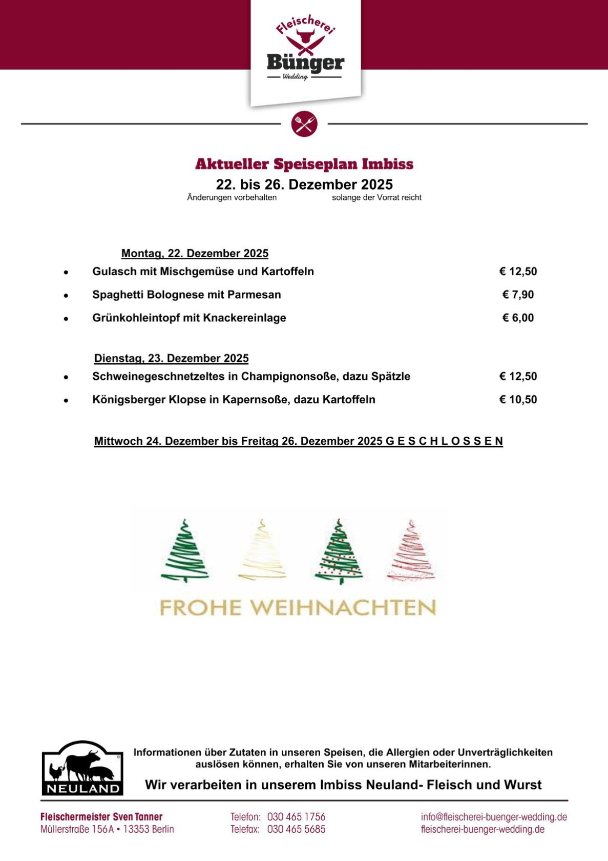 Heiligabend, 1. und 2. Weihnachtstag Geschlossen